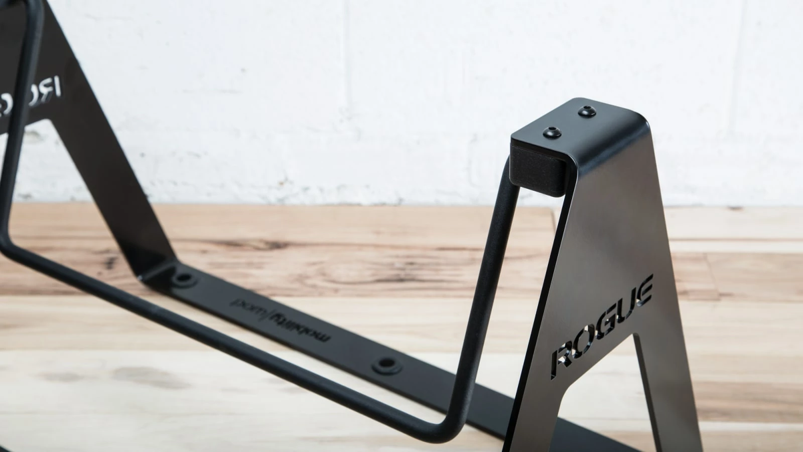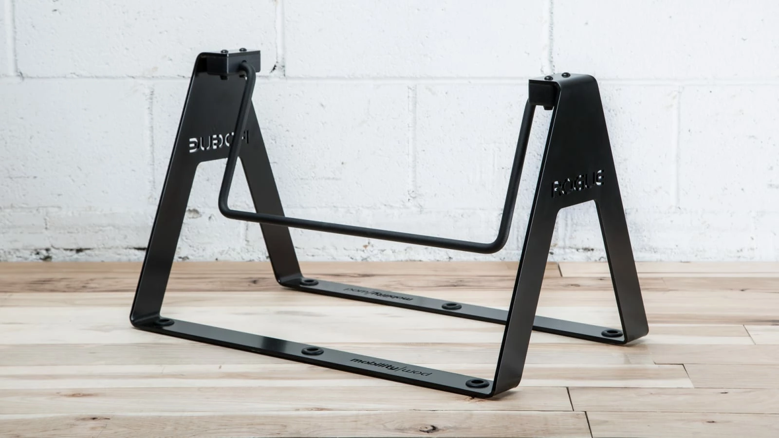 The portable, stand-alone Rogue Fidget Bar features a 0.1875” thick laser-cut steel frame with a satin black powder coat finish. The footrest bar itself is made from solid steel with a standard texture black powder coat, and measures 17.5” across and 0.5” in diameter. It sits within a UHMW plastic block on each side of the frame, and moves in a fluid motion with no unwanted noise. We’ve also included (6) rubber grommets at the base of the unit to prevent sliding and protect your flooring. All Fidget Bars include both the Rogue and MobilityWOD logos laser-cut into the steel.
